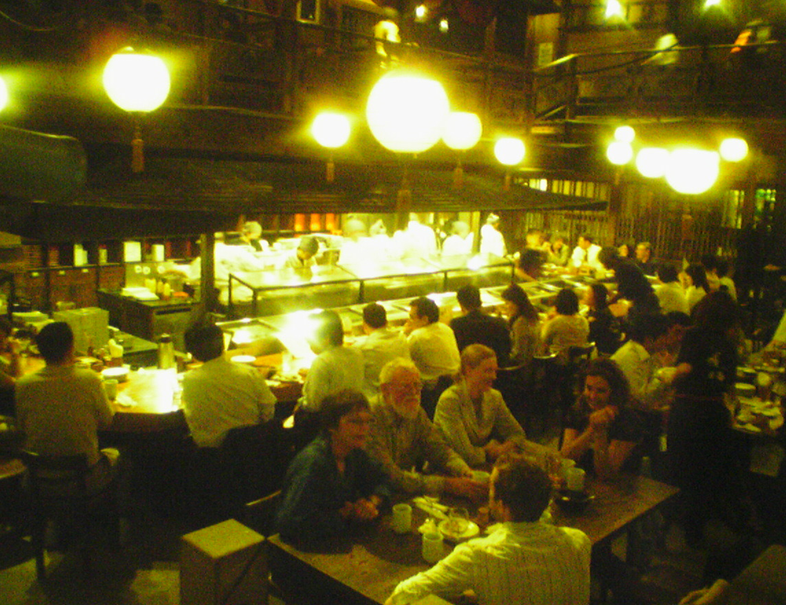 さて、店内の雰囲気作りですが、これは流石といってよいでしょう。100席と少し位の店ですが、一階のカウンター席とフロア席、そして二階の個別の席からも店内が見渡せて、きびきびした店員の動きがよくわかります。カウンターの中には10名位の調理人が居ますが、みな実にきびきびよく働いていて、誰も手持ちぶたさに「ボー」っとしていることがありません。このきびきび感がこの店の売り物かも知れないなと感じました。
